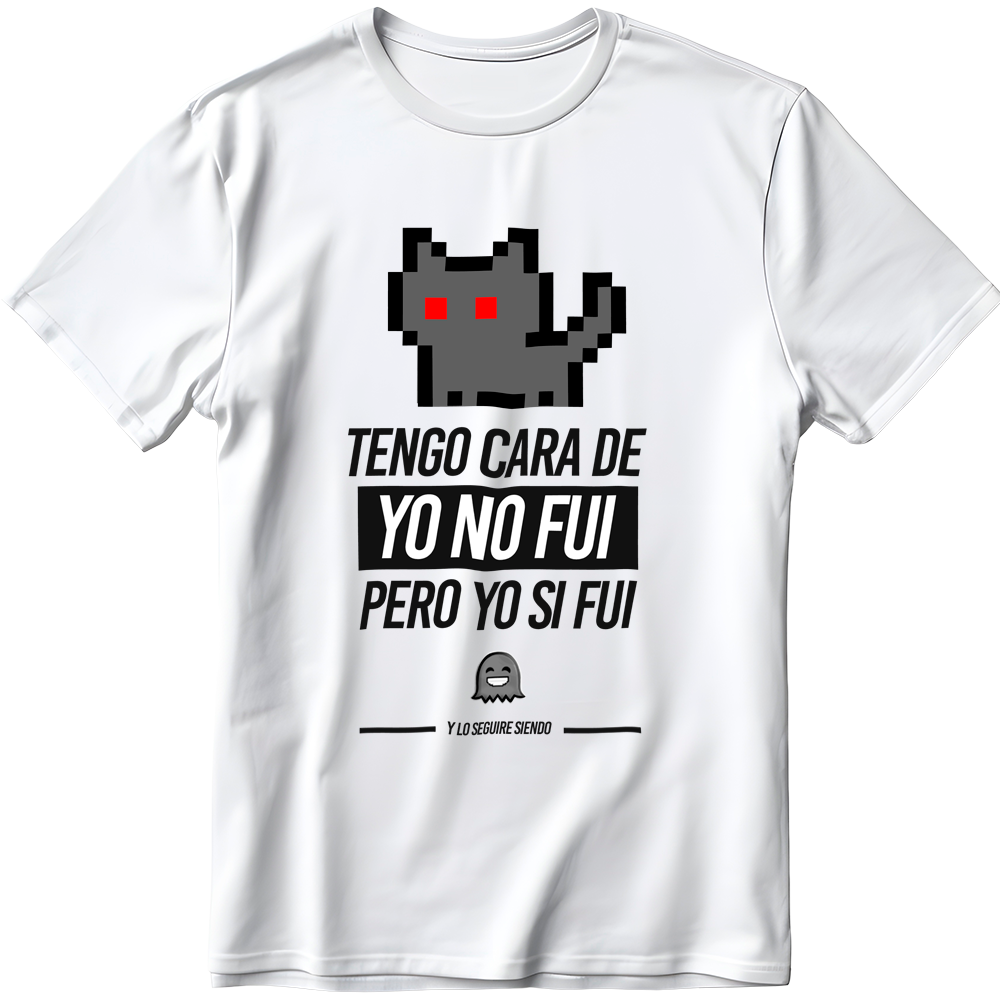 Remera Yo Sí Fui – Classic Edition de Miguel Gamer, en color blanco con el logo del canal, la frase «Tengo cara de ‘yo no fui’, y yo sí fui… y lo seguiré siendo», acompañada de un tierno gatito negro con ojos rojos.