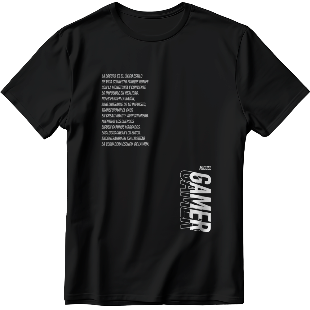Remera Locura – Freedom Edition de Miguel Gamer, la prenda más exclusiva del canal, con un diseño de alta calidad y la poderosa frase sobre la locura como esencia de la vida.