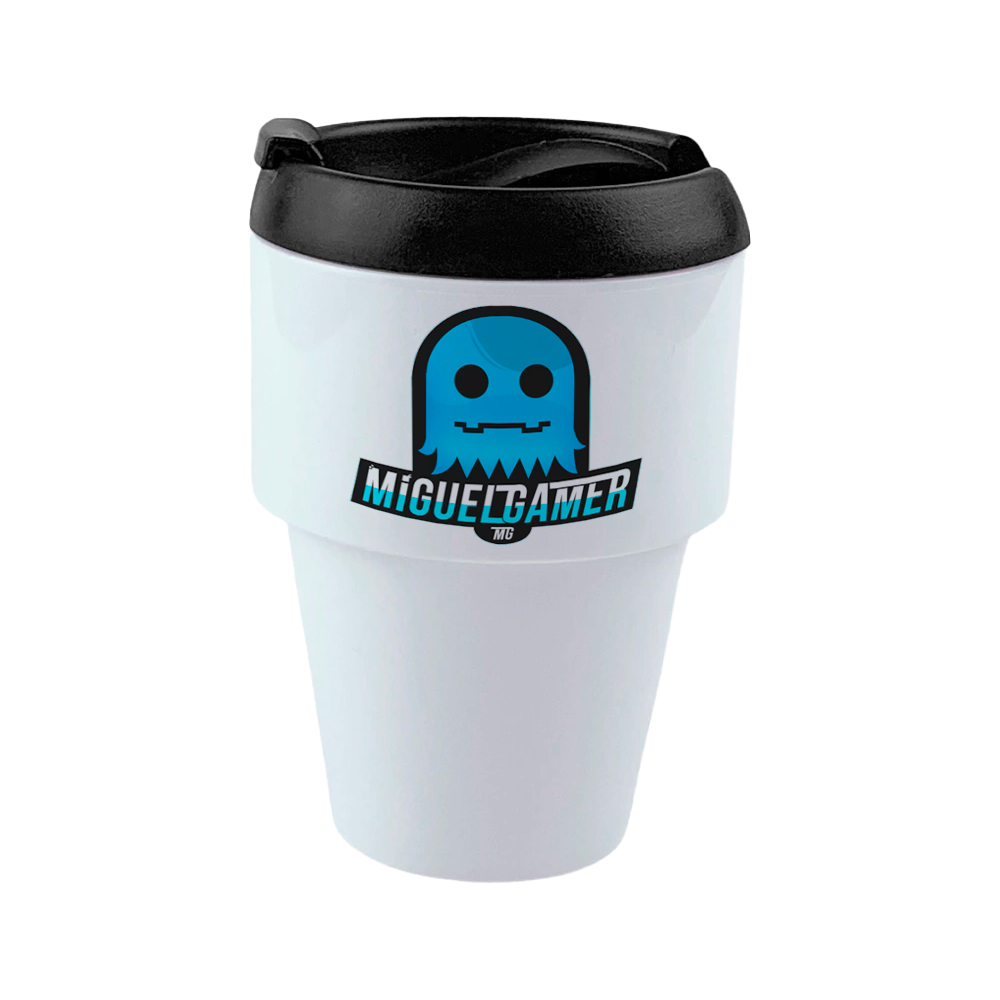 Vaso oficial de Miguel Gamer, con tapa y cierre seguro para llevar tu café a todas partes.