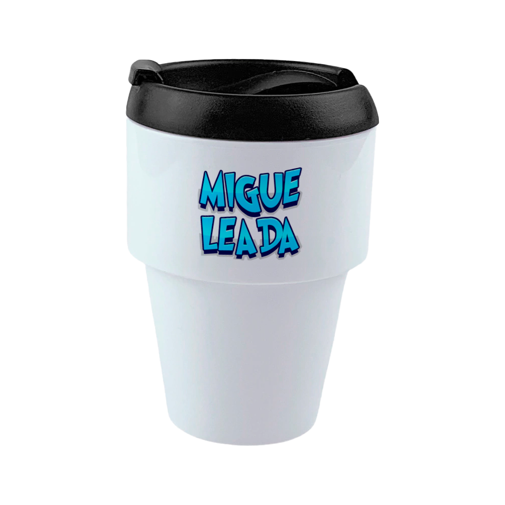 Vaso oficial de Miguel Gamer, con tapa y cierre seguro para llevar tu café a todas partes.